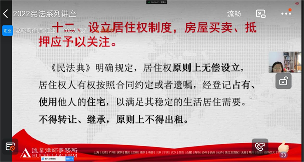 趙律師在憲法解讀方面,從憲法的地位、憲法的發展歷史、我國憲法的架構及具體內容進行了解讀,在民法典之合同熱點解讀方面,就民法典中涉及的電子合同、預約合同、情勢變更制度等熱點問題進行了講授,在公司行業性質方面,就民法典關于審理建設工程施工合同糾紛案件適用法律問題的解釋進行了解讀。