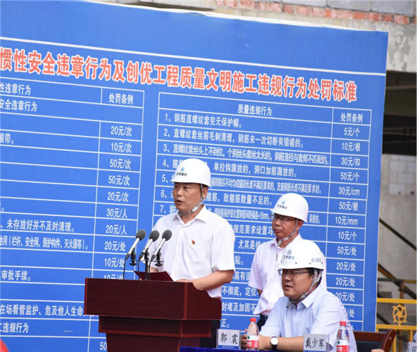 現(xiàn)場,新區(qū)公司總經(jīng)理殷翔同志首先代表新區(qū)公司向前來參加活動(dòng)的領(lǐng)導(dǎo)表示感謝,并對奮戰(zhàn)在一線的同志們和工友們表示問候,接著對瑞嶺嘉苑項(xiàng)目進(jìn)行了簡要介紹。他講到,在接下來的建設(shè)任務(wù)中,新區(qū)公司將繼續(xù)發(fā)揚(yáng)“以人為本、促進(jìn)和諧、安全生產(chǎn)”的優(yōu)良作風(fēng),把防暑降溫工作和勞動(dòng)安全保障措施落實(shí)到項(xiàng)目一線,激勵(lì)一線建設(shè)者再接再厲,高效施工,確保優(yōu)質(zhì)高效地完成后續(xù)施工任務(wù)。