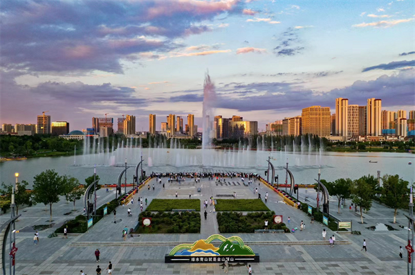 落霞與噴泉齊飛的蘭州新區棲霞湖景觀