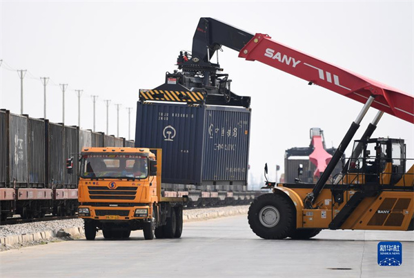 工作人員在蘭州新區中川北站物流園裝卸貨物(2022年8月11日攝)。新華社記者 陳斌 攝
