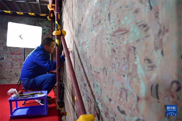 敦煌研究院文物保護技術服務中心壁畫修復師楊金禮在莫高窟第231窟內修復出現病害的壁畫(2022年4月19日攝)。新華社記者陳斌 攝