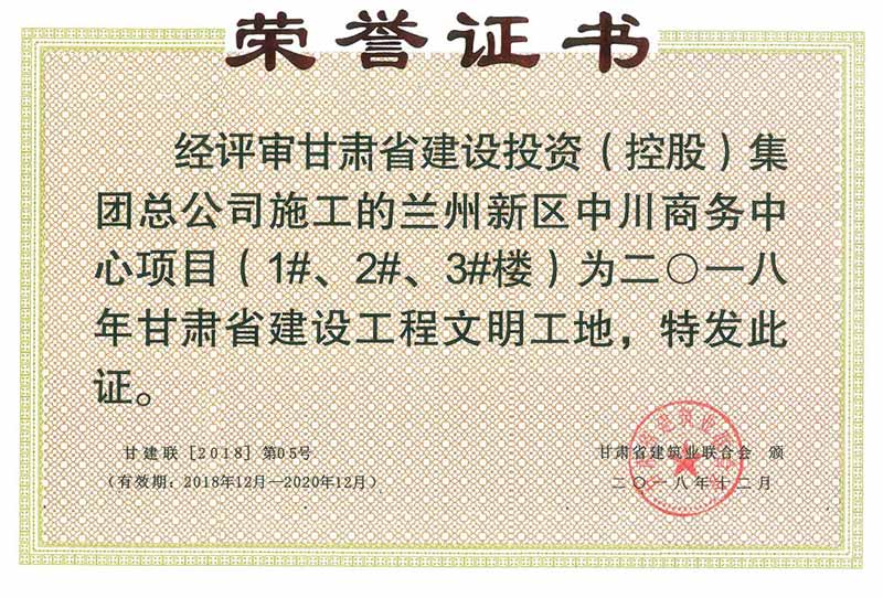 甘肅省建設(shè)工程“文明工地”榮譽(yù)證書